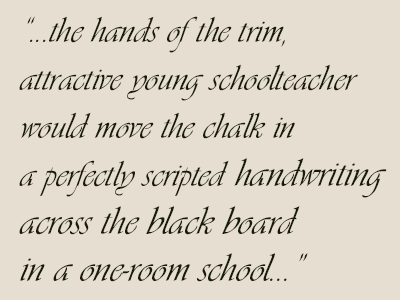 As I sit beside her hospital bed and watch her ever so slowly drawing what could be her last breath, I hold her hand in mine, rubbing each finger individually. Tonight, her hands are swollen from excess fluid and turning to a deep purple color. As the young girl grew, her fingers would soon be making melodies on the keys of a piano. These fingers would later take the last exam in high school and proceed on to a year of college acquiring a teacher's certificate. Then the hands of the trim, attractive young schoolteacher would move the chalk in a perfectly scripted handwriting across the black board in a one-room school.